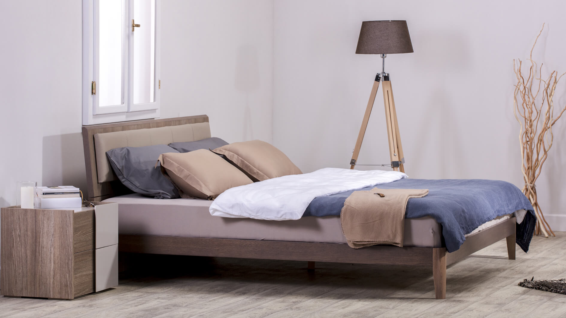 The headboard is made of refined chipboard in a dark oak sonoma pattern. The bed box is made of plywood coated with oak veneer, toned and varnished to get the sonoma effect of dark oak. The legs of the bed are made of solid oak in the same tone and elegantly separate the bed from the floor.