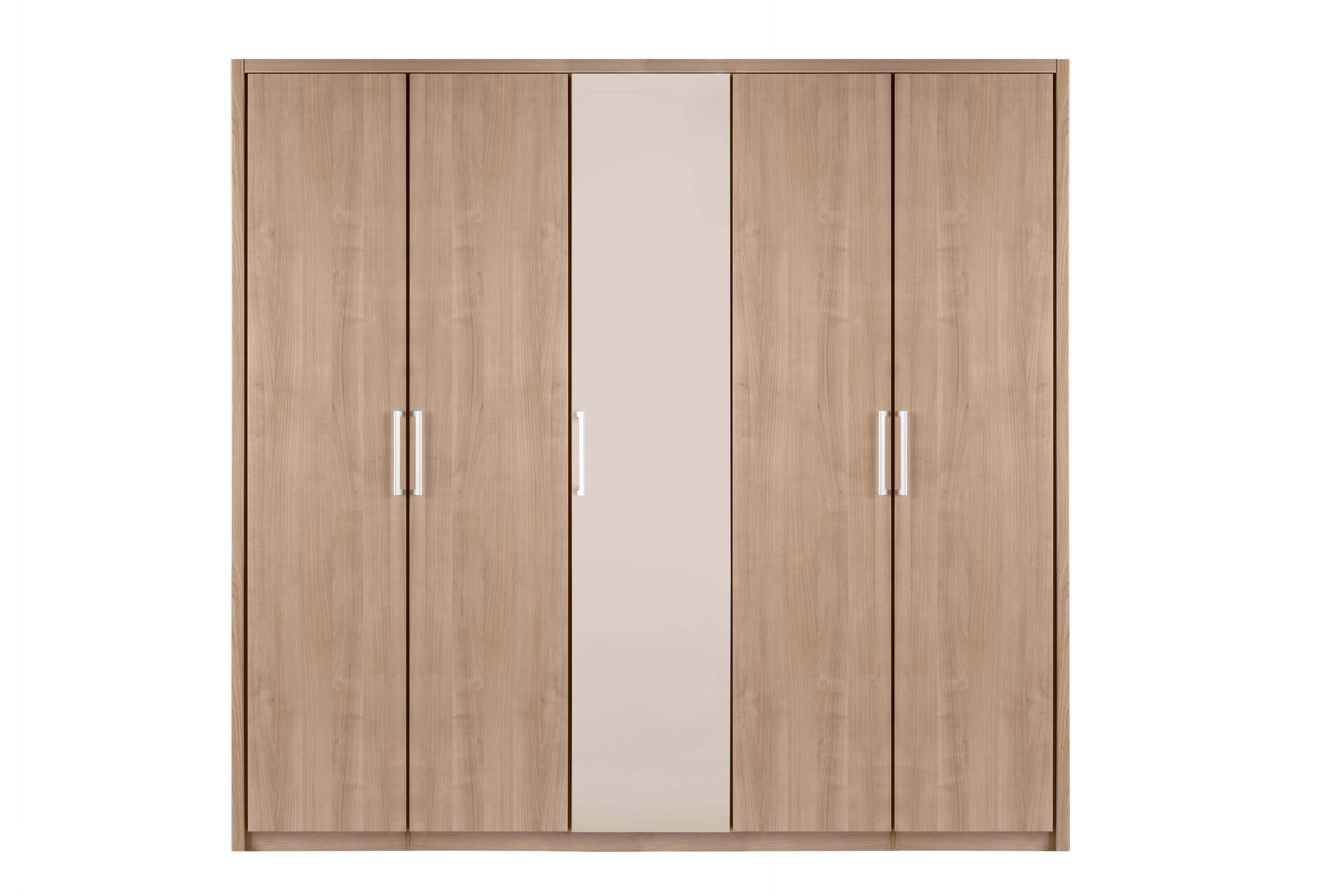 Keln wardrobe measuring 234 x 58.6 x 222.7 cm is a five-wing model with a classic door. There are four sections in the middle. To the left and right is a positioned space with one large wardrobe bar and one shelf.