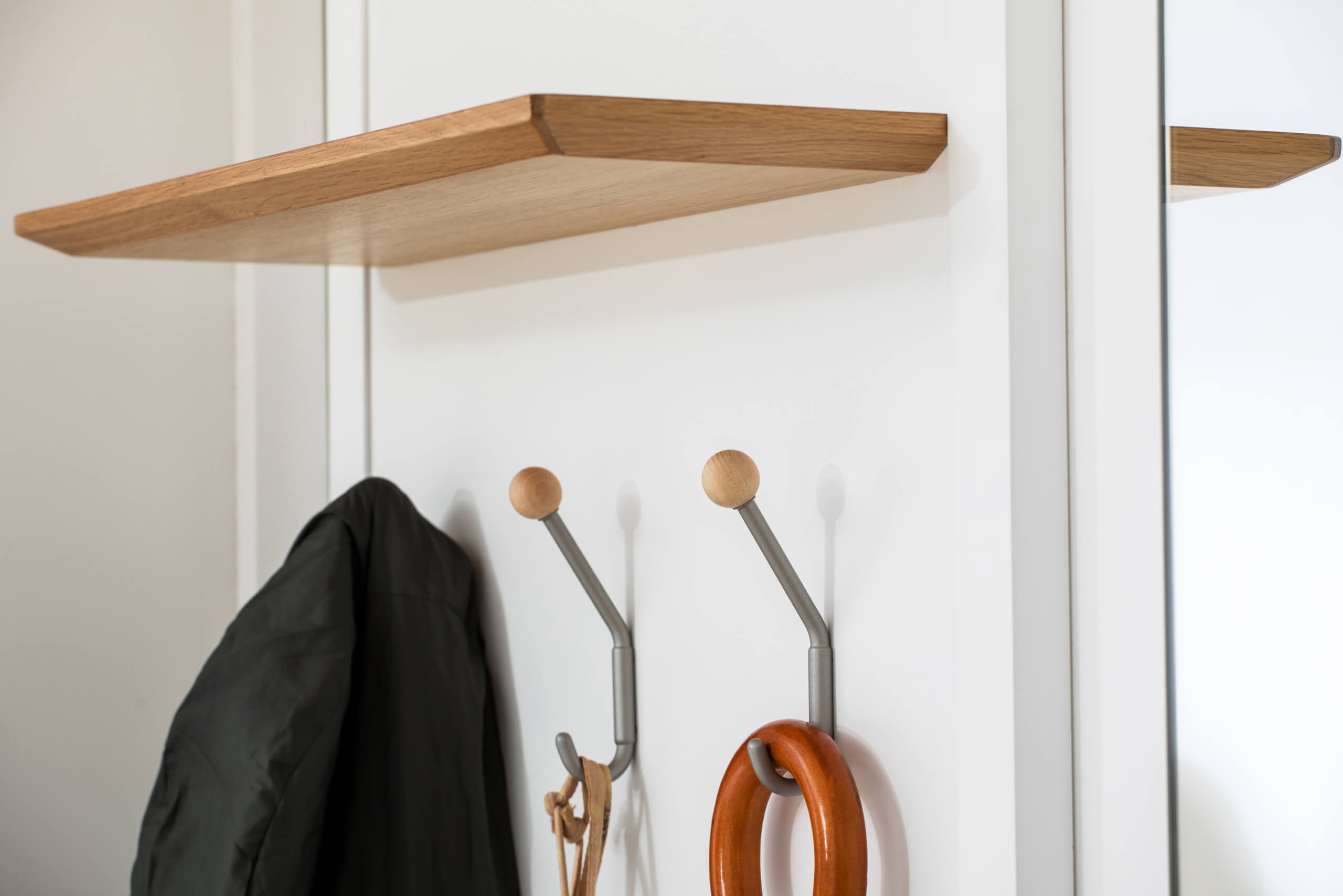 Nostalgija hat stand is fixed on the wall. It has two double-sided hangers on which you can hang clothes. The upper shelf provides additional storage space and various useful items will find their place on it.