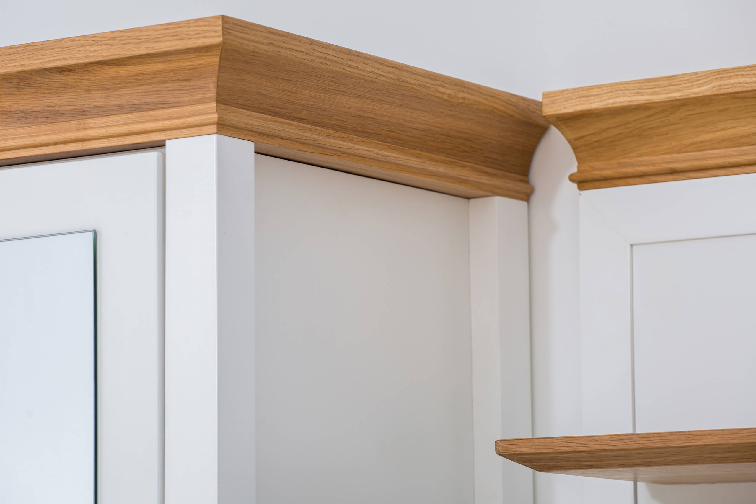 Nostalgija hat stand is made in white, with a shelf and an application in the color of oak. The back is made of beech frame with refined MFC filling. The decorative application is made of oak wood. The shelf is made of MDF and covered with oak veneer with edge moldings made of solid oak.