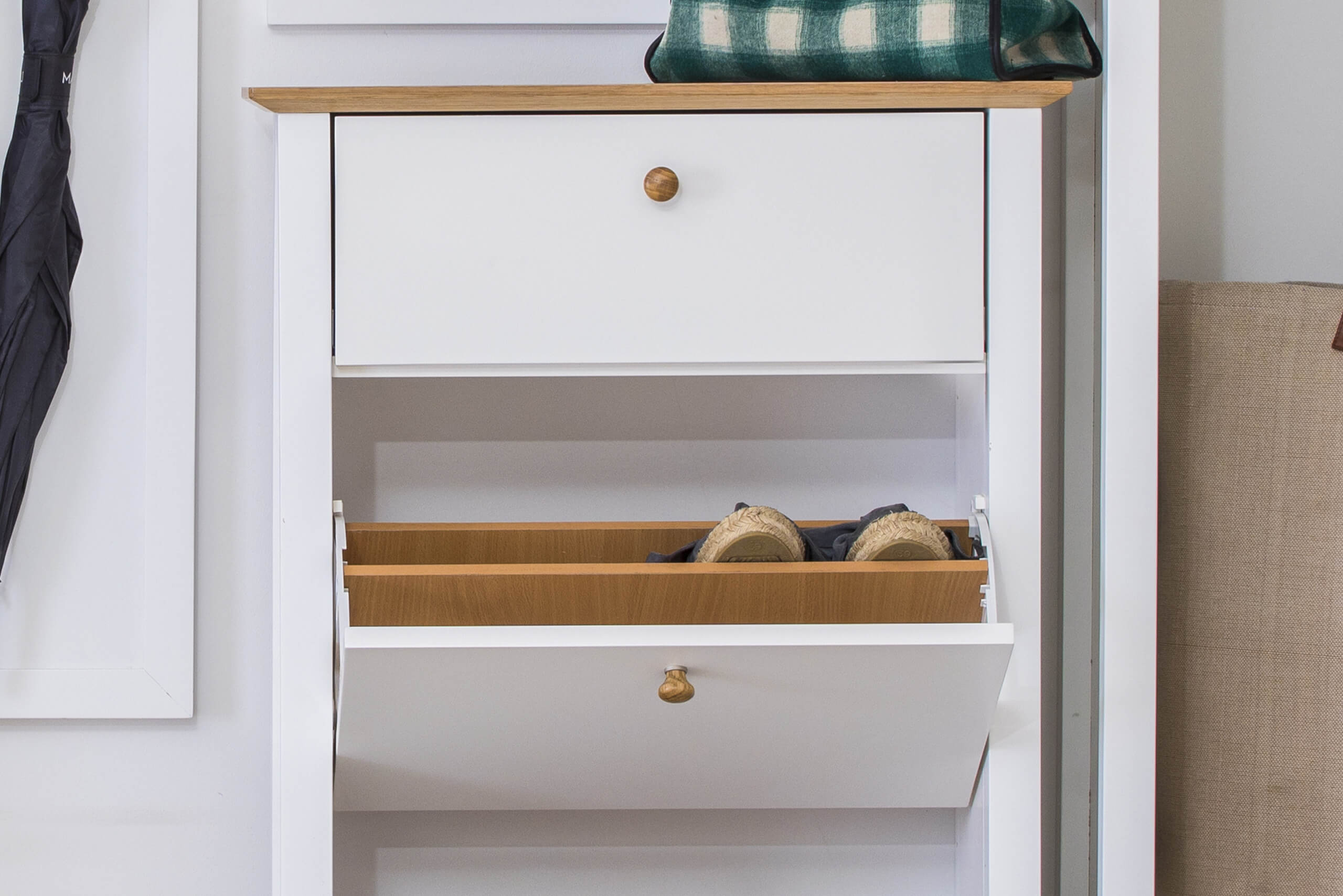 Nostalgija shoe rack has three segments. The first segment is a practical drawer where you can keep shoe accessories and various small items that you need every day. The other two segments have a sloping door where you can place your shoes in two rows so that they are always neatly organized. The upper surface of this shoe rack can be used to drop a bag, sunglasses, keys or some decoration if you want to decorate the ambience.