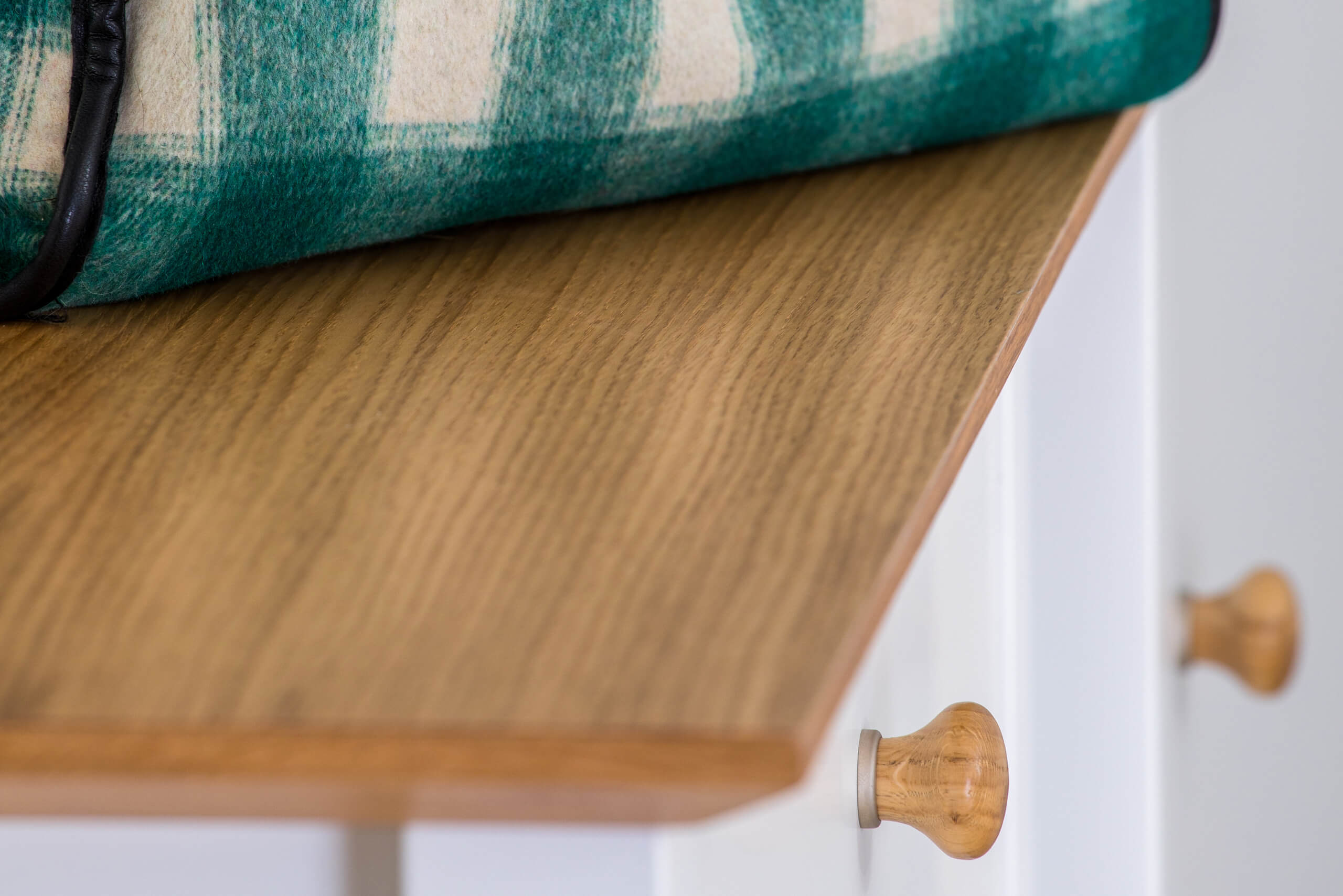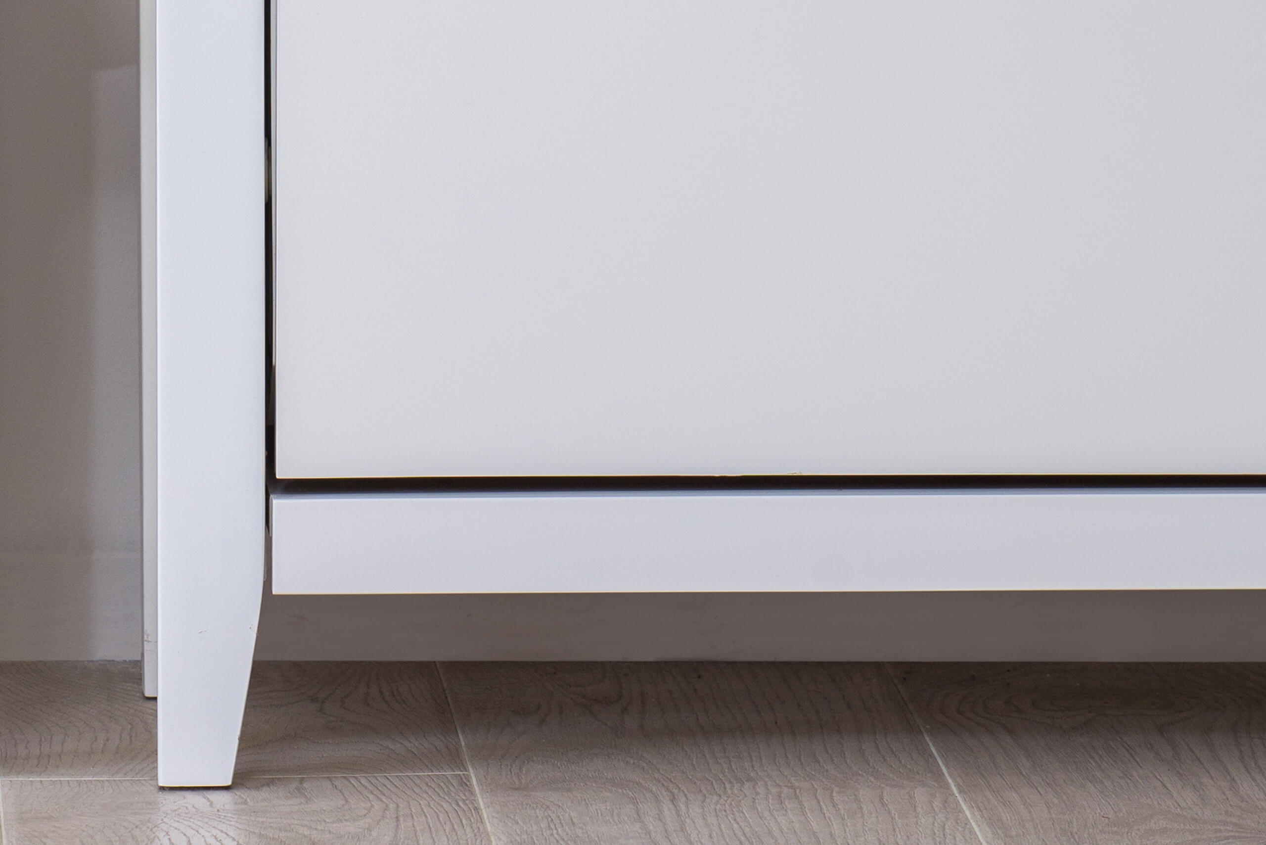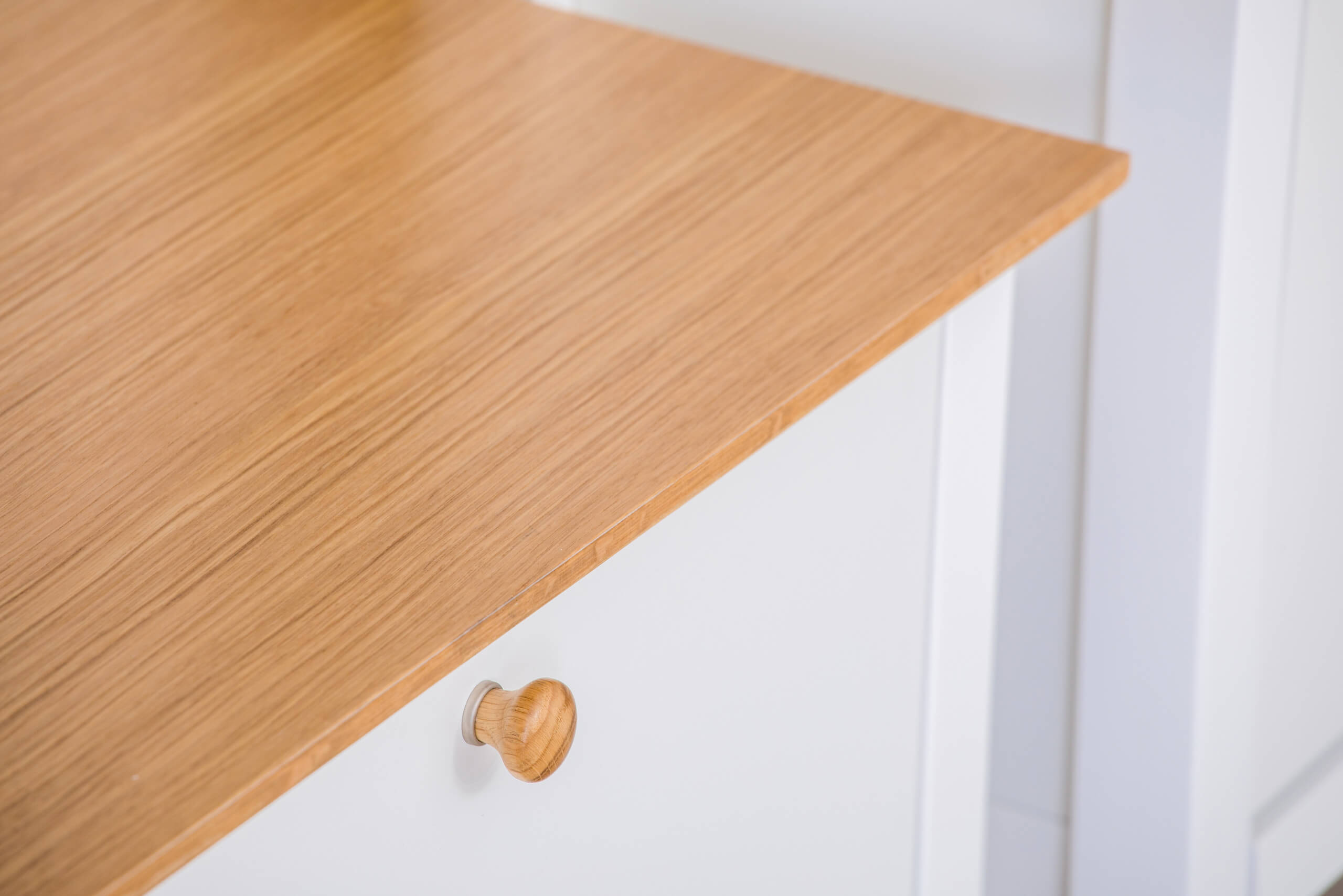 Simple design Nostalgija shoe rack adorned with white. A special detail contributes to the attractive appearance of the model – the upper panel with profiled edging moldings of beech wood, covered with oak veneer. Other elements of the structure and fronts are made of white MFC. Pillars that have the function of legs are made of solid beech wood.