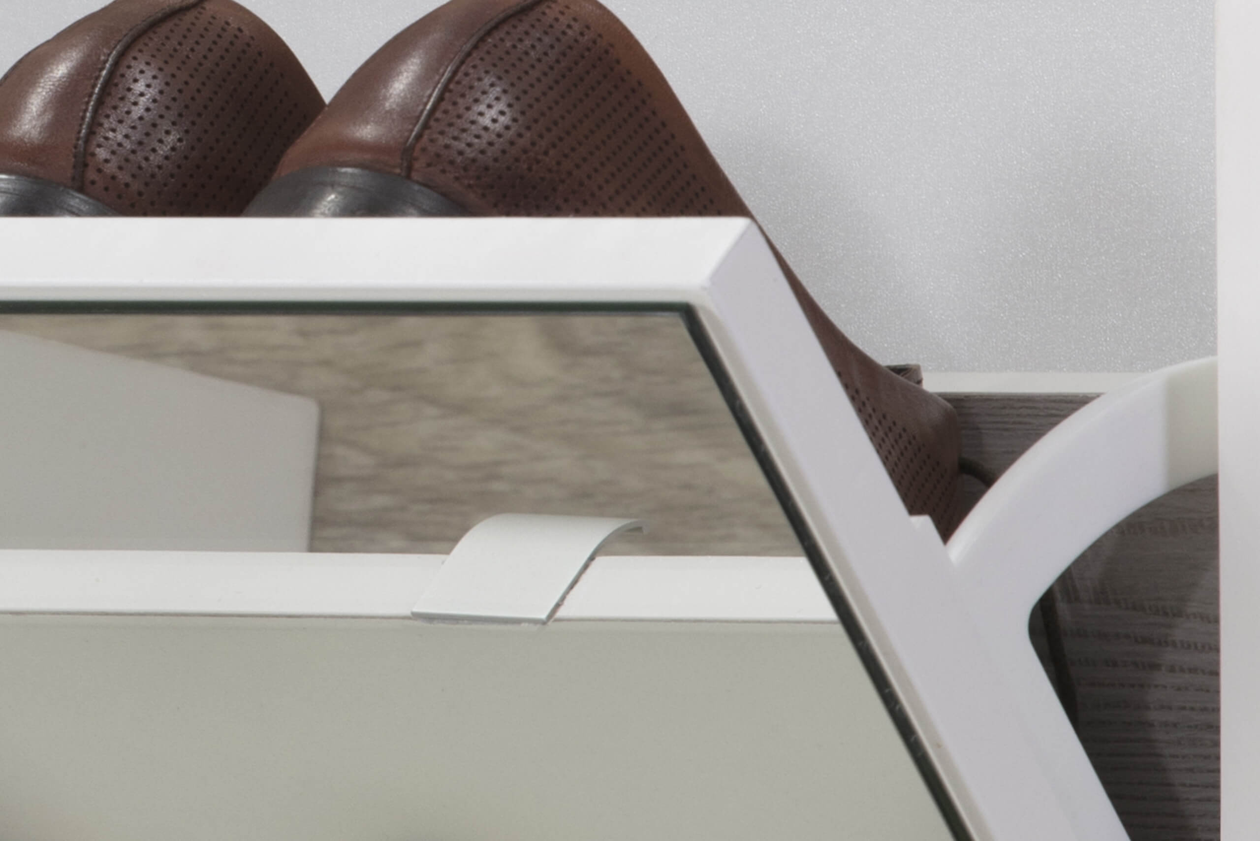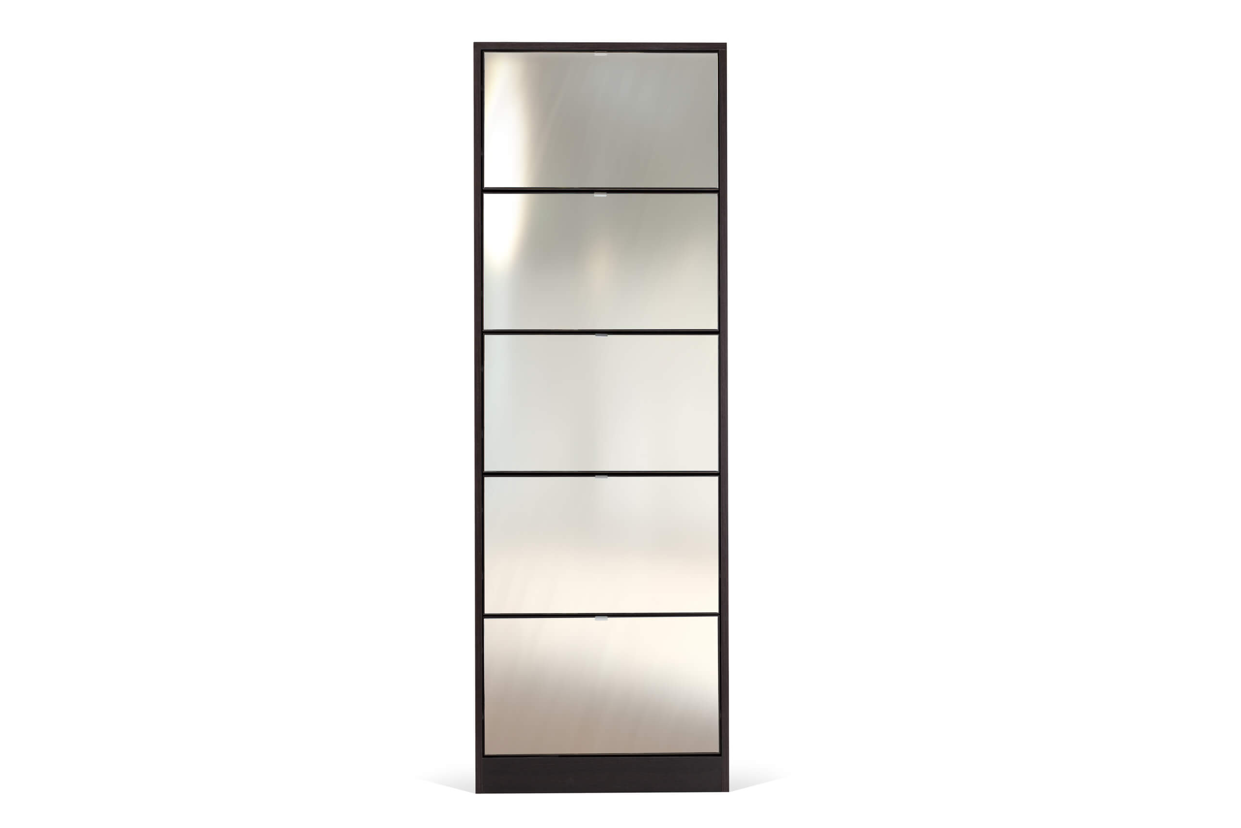 The slim shoe rack measuring 62 x 18 x 183 cm with a mirror is a five-segment model with a sloping door. There is a discreet aluminum handle on the door that serves to open it. There is enough space to easily arrange your shoes and sort them by seasons. It is placed on the floor and attached to the wall. With it, you will make the most of the space because it is tall and narrow. A special benefit are the mirrors on the fronts, which visually enlarge the space and reflect other elements in the hallway.