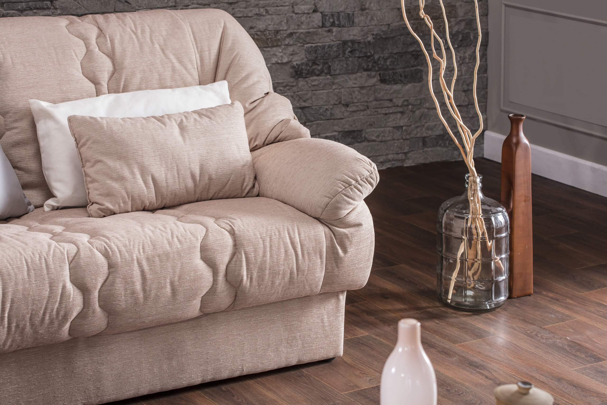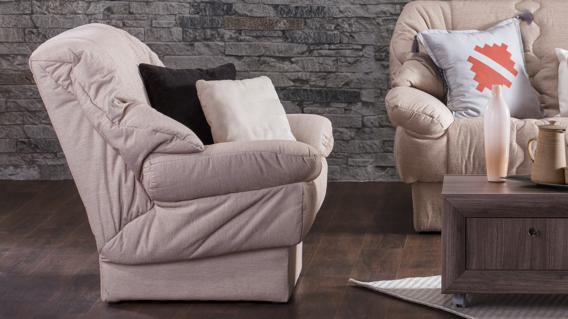 The Nevena armchair coated in soft, puffy upholstery and pillows entices you to sit comfortably in it and rest for a long time. It is designed so that it provides your body with the necessary rest, and the spine is perfectly supported thanks to an additional pillow that you can place behind your back.