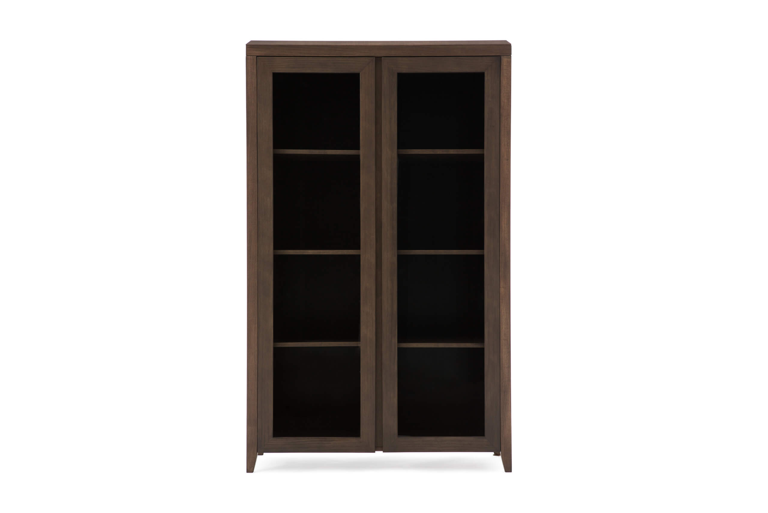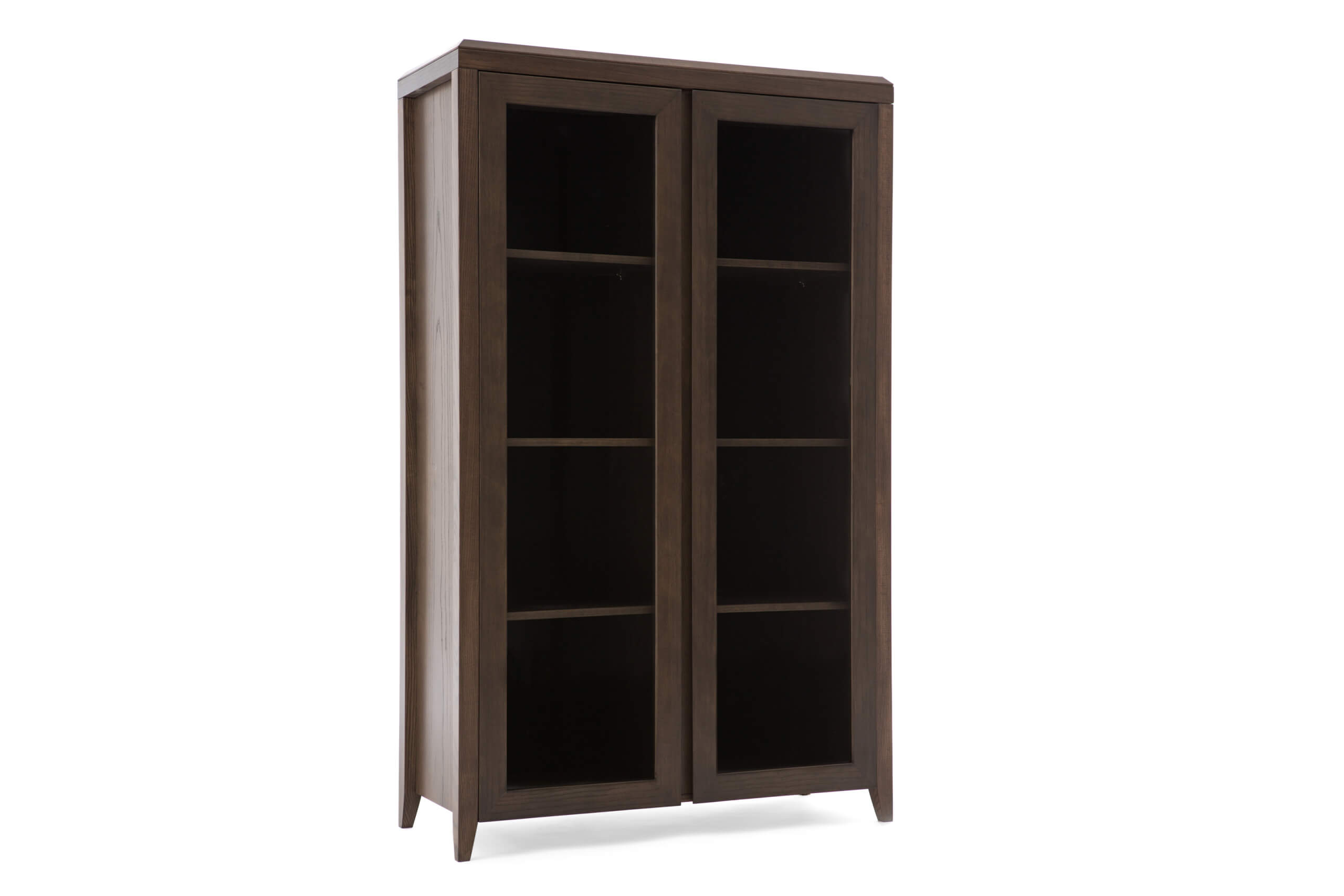 The Safira display cabinet is made of quality ash veneer and solid wood with a finish in dark oak tone. The plank top is made of veneered chipboard with solid wood edge moldings. The other elements on the structure are also made of veneered chipboard, while the door frame is made of veneered MDF. The legs, which elegantly lift this display cabinet, are made of solid wood ash.