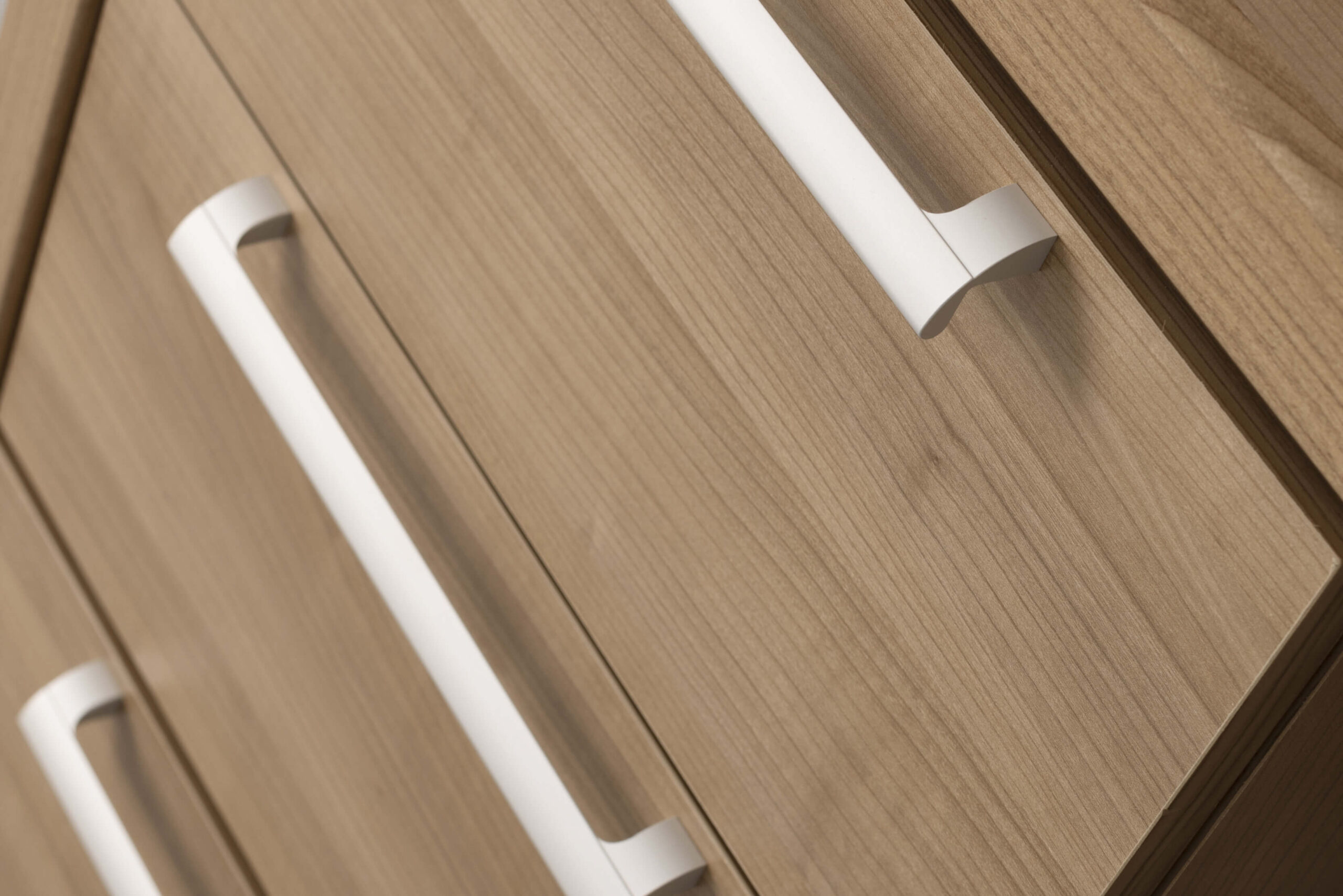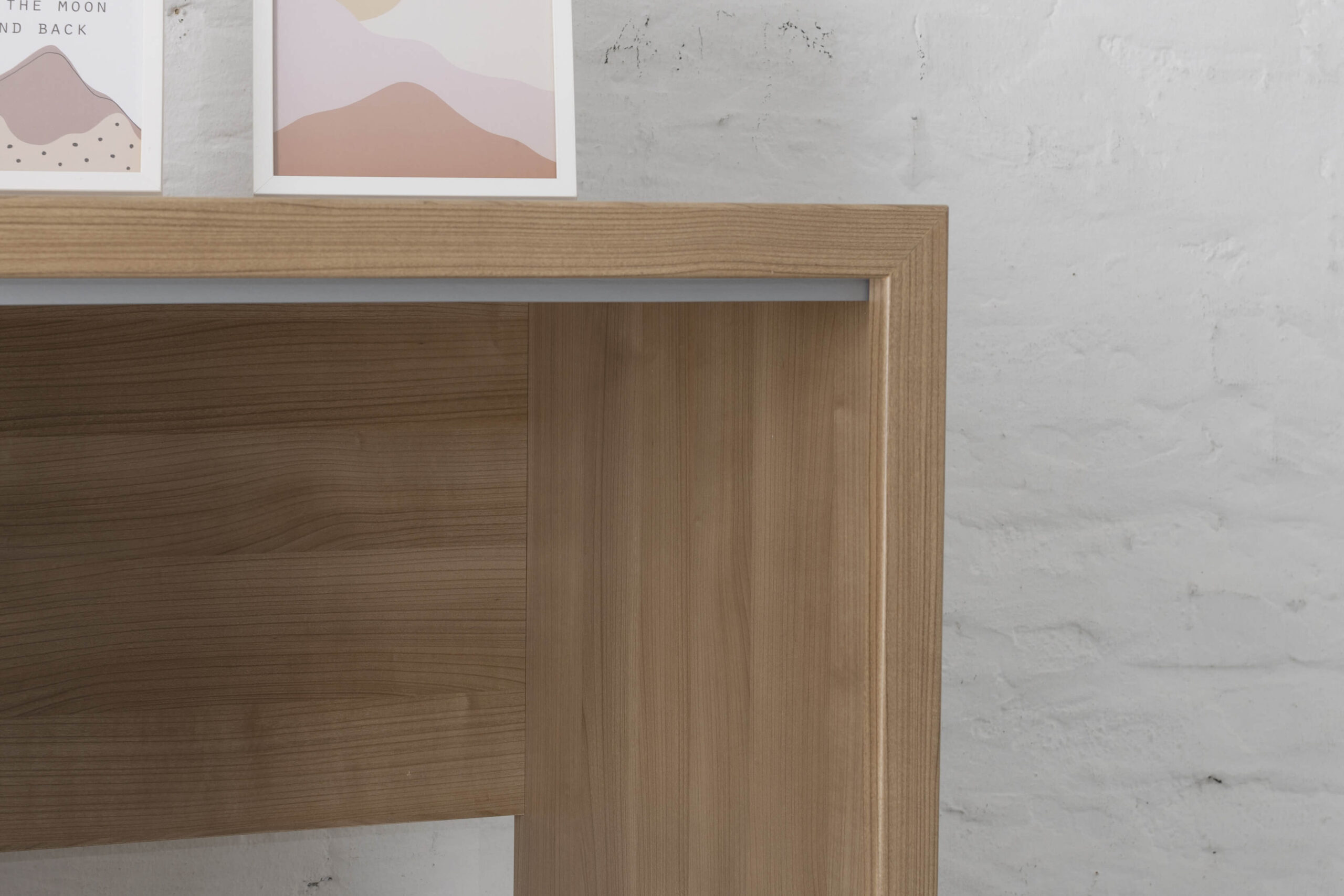 Keln radni sto napravljen je u kombinaciji oplemenjene iverice i medijapana. Korpus i prednji dio na fiokama su od oplemenjene iverice u trešnja dezenu. Lajsne na stranicama i na ploči stola su od medijapana presvučenog fleks folijom sa teksturom trešnje.